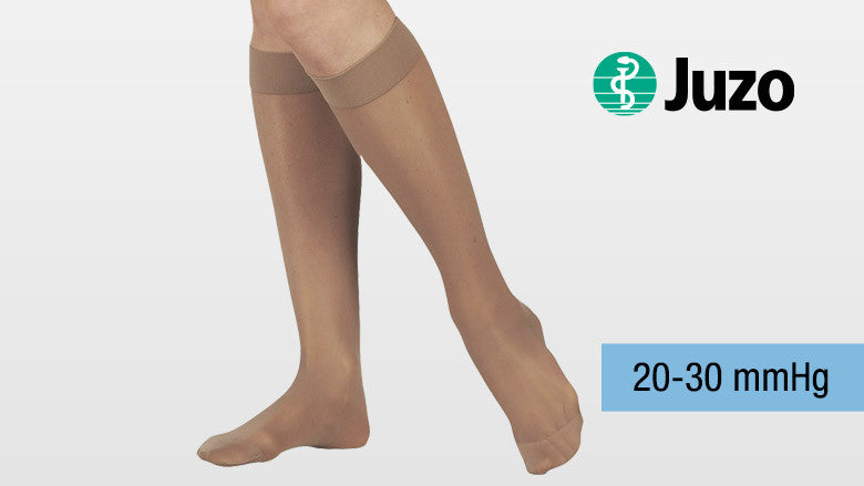 Juzo Naturally Sheer knee high compression stockings are beautifully sheer and fashionable. Naturally Sheer compression stockings are also ideal for reducing swelling and increasing circulation in your legs. Available in a medium 20-30 mmHg compression. Naturally Sheer comes in many great colors to match any wardrobe. You can also choose to have an open toe style.
