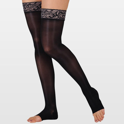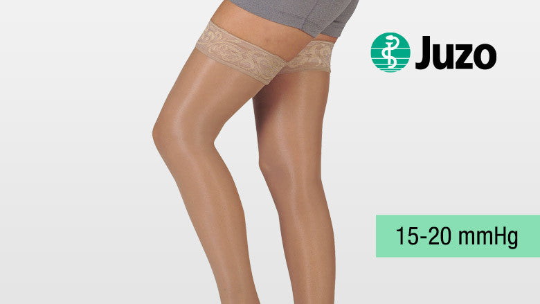 Juzo Naturally Sheer thigh high compression stockings are beautifully sheer and fashionable. Naturally Sheer compression stockings are also ideal for reducing swelling and increasing circulation in your legs. Available in light 15-20 mmHg compression. Naturally Sheer comes in many great colors to match any wardrobe. You can also choose to have an open toe style.