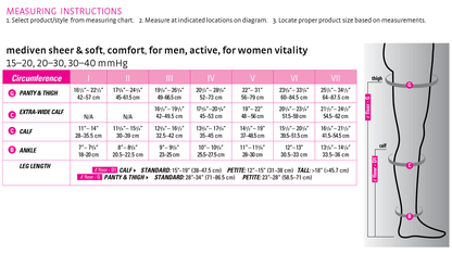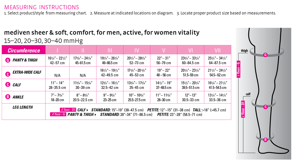 You may need to take a measurements to get your size. With your leg measurements, look up your size in the sizing chart in the images, or check out the Mediven Sizing Chart in a PDF.