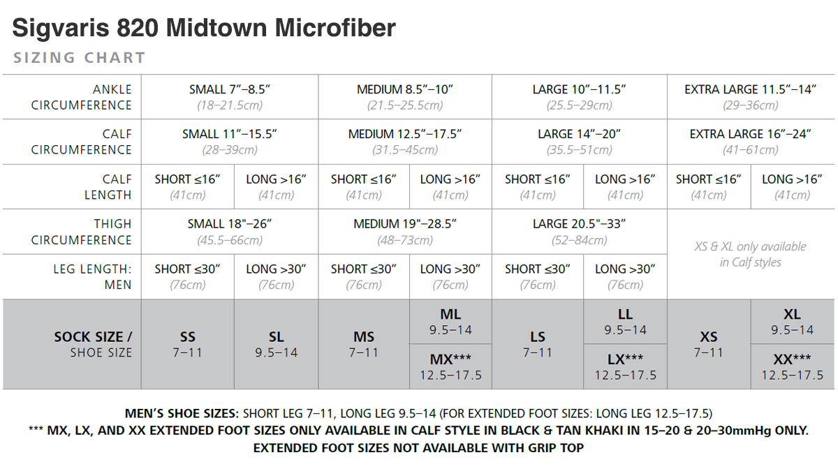 Choose your size. You may need to take a measurements to get your size. With your leg measurements, look up your size in the sizing chart in the images, or check out the Sigvaris Sizing Chart in a PDF.